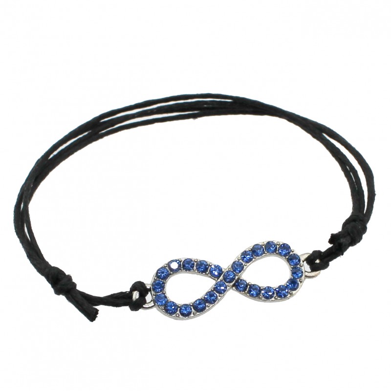 Bransoletka sznurkowa celebrytka z metalowym łącznikiem nieskończoność z cyrkoniami w kolorze niebieskim.
