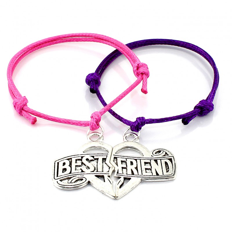 Komplet bransoletek sznurkowych z uzupełniającymi się zawieszkami w postaci serca z napisem BEST FRIEND, w 19 kolorach sznurka do wyboru.