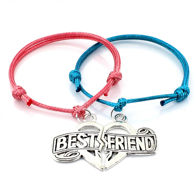 Komplet bransoletek sznurkowych z uzupełniającymi się zawieszkami w postaci serca z napisem BEST FRIEND, w 19 kolorach sznurka do wyboru.