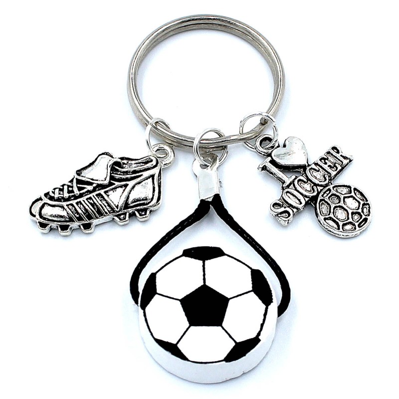 Przedmiotem sprzedaży jest baza kółko do breloka z trzema zawieszkami - drewnianą piłką, butem i I LOVE SOCCER.