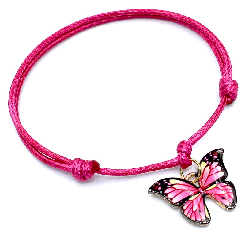 Przedmiotem sprzedaży jest bransoletka sznurkowa w 19 różnych kolorach sznurka do wyboru, z zawieszką emaliowaną motylkiem w kolorze różowym.