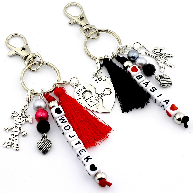 Oprócz uzupełniających sie zawieszek na brelokach znajdują się również: czerwony i czarny chwost, zawieszka serce z koralikami oraz zawieszki dziewczynka i chłopiec.