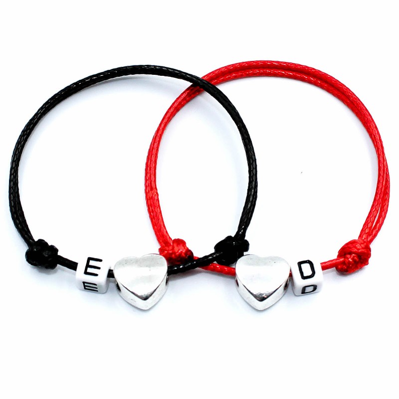 Przedmiotem sprzedaży jest komplet bransoletek sznurkowych w 21 różnych kolorach sznurka do wyboru, z ozdobnym sercem oraz dowolnym napisem.