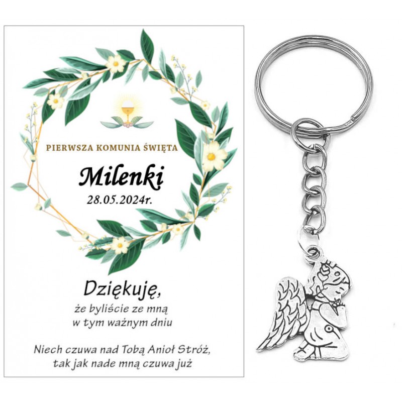 PAMIĄTKA PREZENT UPOMINEK DLA GOŚCI - BRELOCZEK ANIOEK Z OZDOBNĄ KARTECZKĄ NA KOMUNIĘ