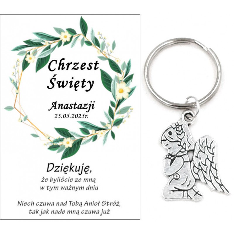 PAMIĄTKA PREZENT UPOMINEK DLA GOŚCI - BRELOCZEK ANIOEK Z OZDOBNĄ KARTECZKĄ NA CHRZEST