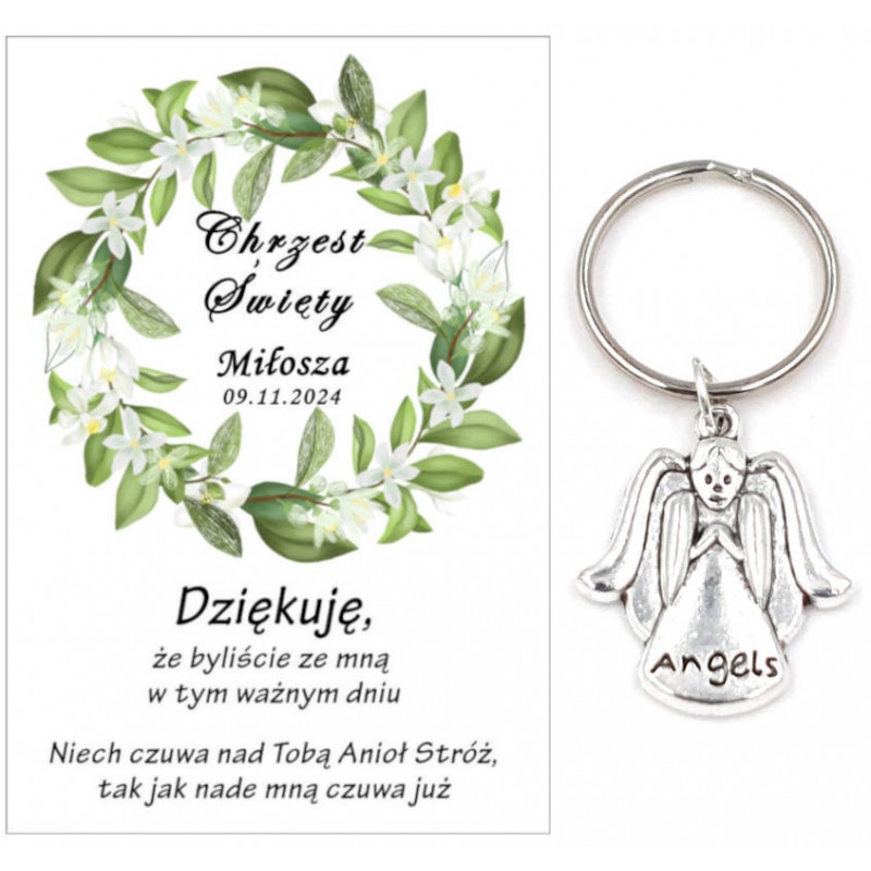PAMIĄTKA PREZENT UPOMINEK DLA GOŚCI - BRELOCZEK ANIOEK Z OZDOBNĄ KARTECZKĄ NA CHRZEST
