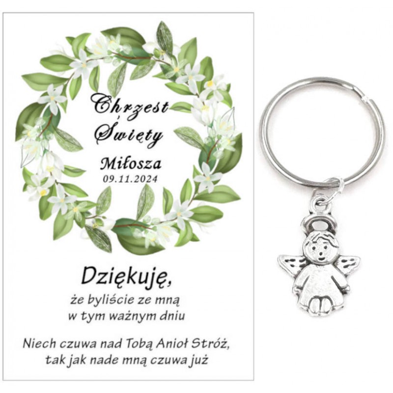 PAMIĄTKA PREZENT UPOMINEK DLA GOŚCI - BRELOCZEK ANIOEK Z OZDOBNĄ KARTECZKĄ NA CHRZEST