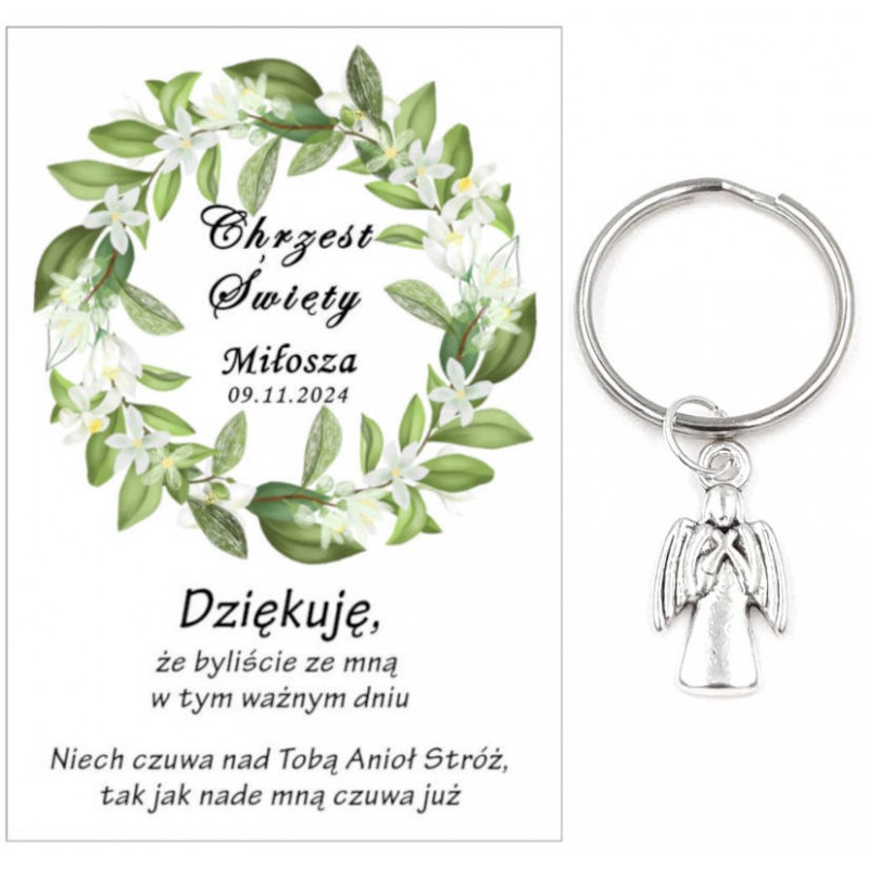 PAMIĄTKA PREZENT UPOMINEK DLA GOŚCI - BRELOCZEK ANIOEK Z OZDOBNĄ KARTECZKĄ NA CHRZEST