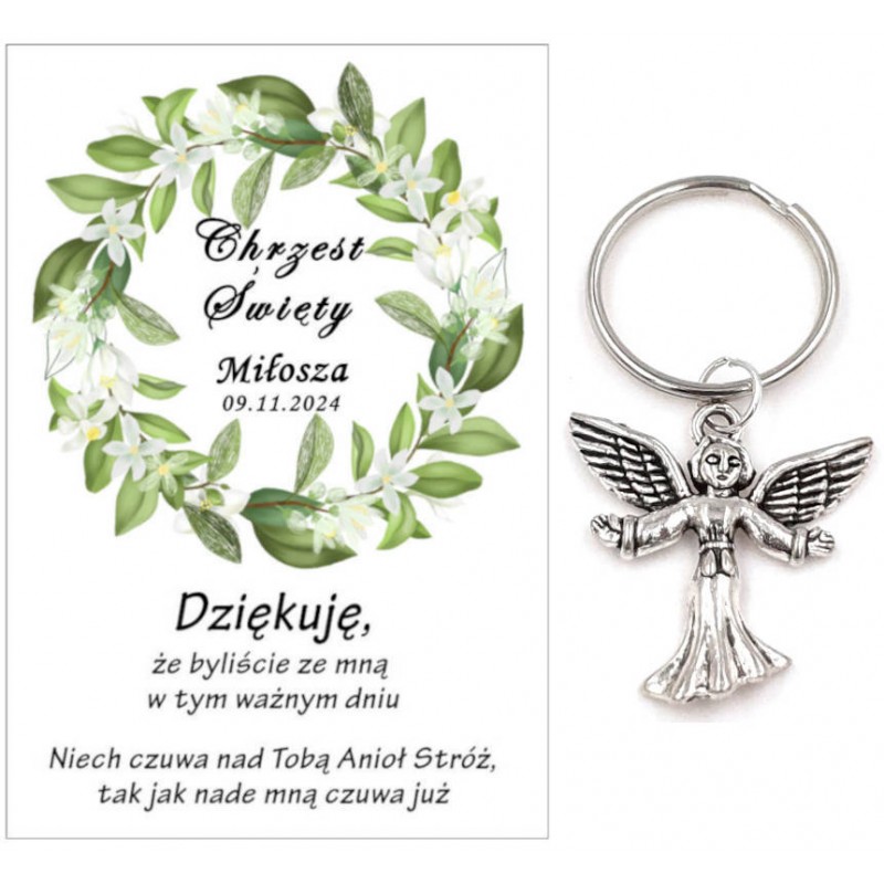 PAMIĄTKA PREZENT UPOMINEK DLA GOŚCI - BRELOCZEK ANIOEK Z OZDOBNĄ KARTECZKĄ NA CHRZEST