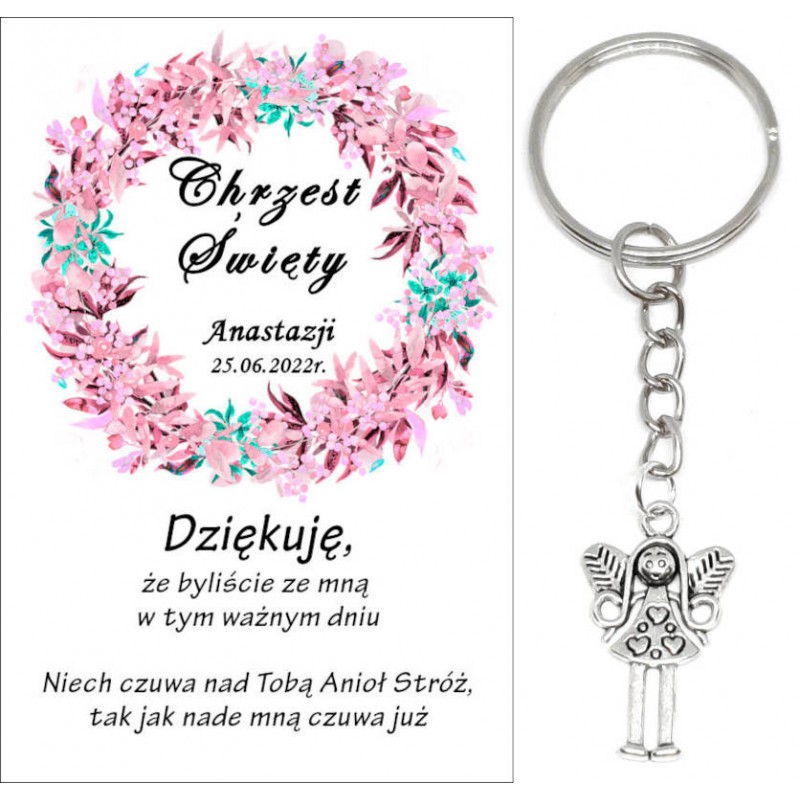 PAMIĄTKA PREZENT UPOMINEK DLA GOŚCI - BRELOCZEK ANIOEK NA ŁAŃCUSZKU Z OZDOBNĄ KARTECZKĄ NA CHRZEST