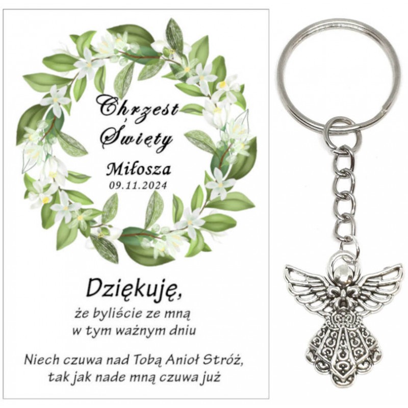 PAMIĄTKA PREZENT UPOMINEK DLA GOŚCI - BRELOCZEK ANIOEK NA ŁAŃCUSZKU Z OZDOBNĄ KARTECZKĄ NA CHRZEST