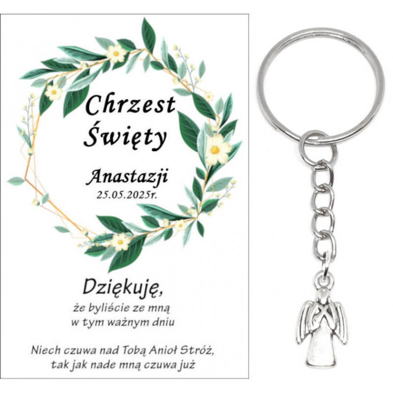 PAMIĄTKA PREZENT UPOMINEK DLA GOŚCI - BRELOCZEK ANIOEK NA ŁAŃCUSZKU Z OZDOBNĄ KARTECZKĄ NA CHRZEST