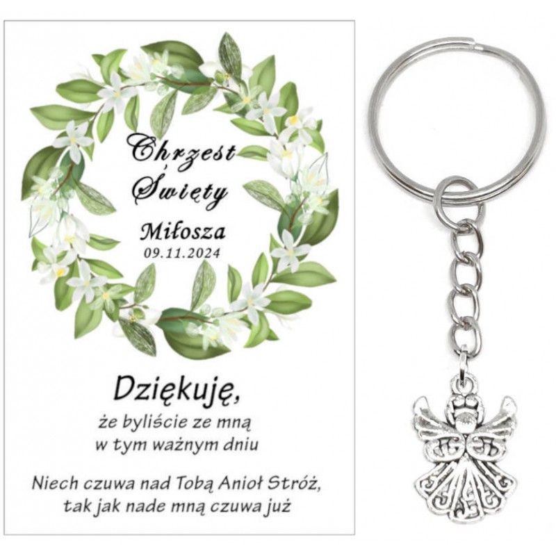 PAMIĄTKA PREZENT UPOMINEK DLA GOŚCI - BRELOCZEK ANIOEK NA ŁAŃCUSZKU Z OZDOBNĄ KARTECZKĄ NA CHRZEST