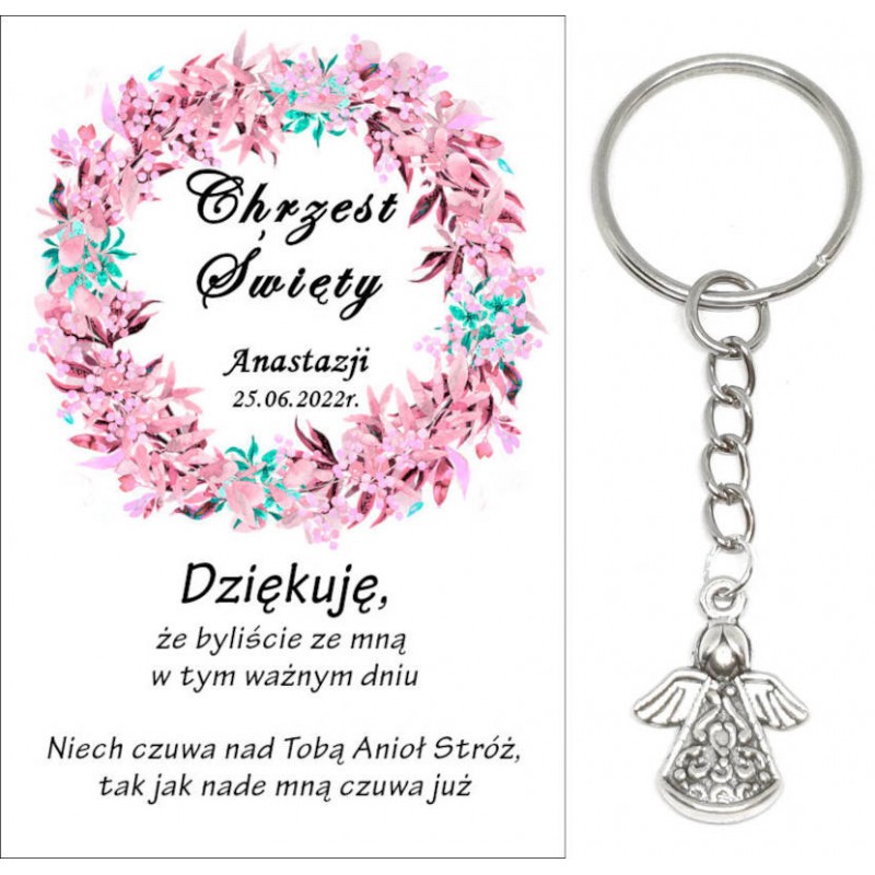 PAMIĄTKA PREZENT UPOMINEK DLA GOŚCI - BRELOCZEK ANIOEK NA ŁAŃCUSZKU Z OZDOBNĄ KARTECZKĄ NA CHRZEST