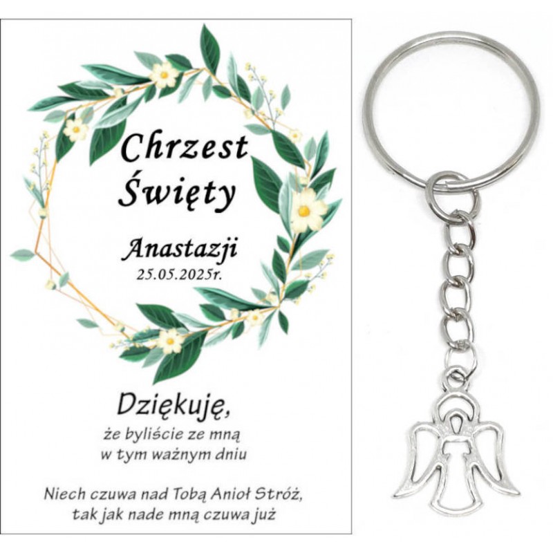 PAMIĄTKA PREZENT UPOMINEK DLA GOŚCI - BRELOCZEK ANIOEK NA ŁAŃCUSZKU Z OZDOBNĄ KARTECZKĄ NA CHRZEST
