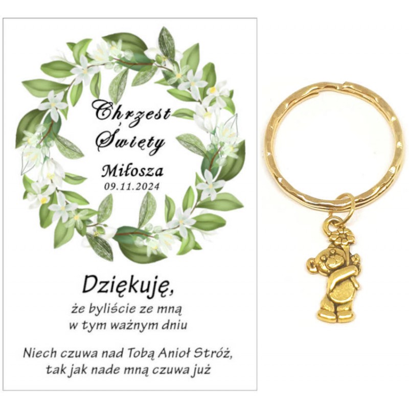 PAMIĄTKA PREZENT UPOMINEK DLA GOŚCI - BRELOCZEK MIŚ Z OZDOBNĄ KARTECZKĄ NA CHRZEST
