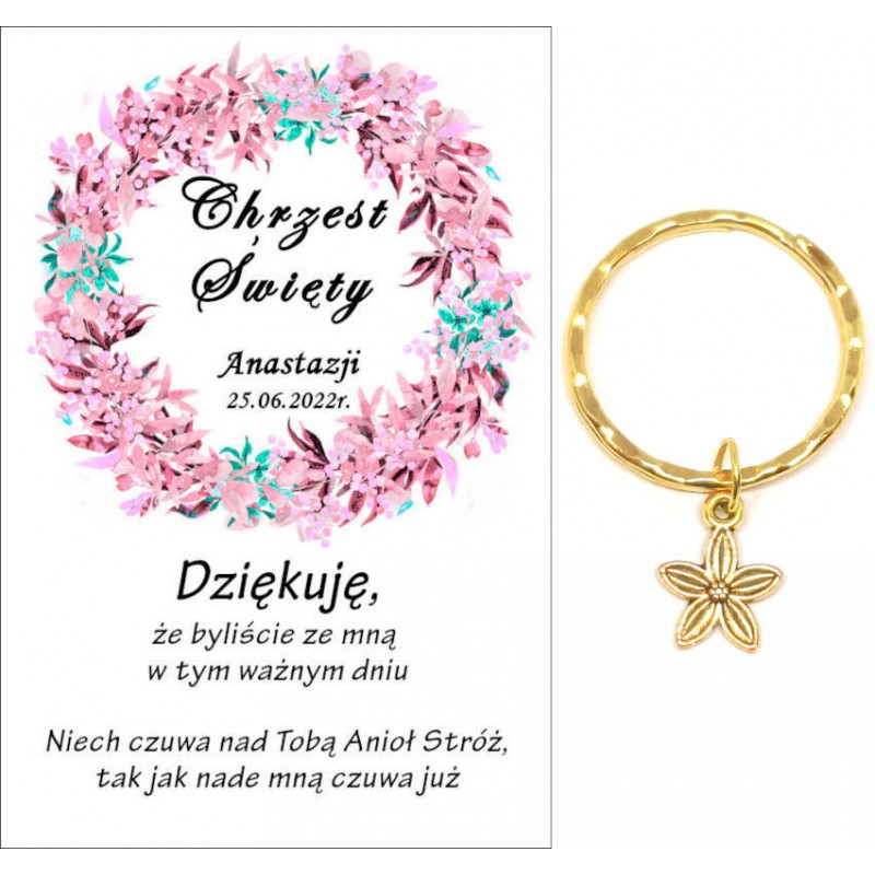 PAMIĄTKA PREZENT UPOMINEK DLA GOŚCI - BRELOCZEK KWIAT Z OZDOBNĄ KARTECZKĄ NA CHRZEST