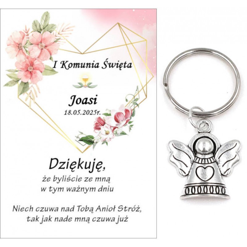 PAMIĄTKA PREZENT UPOMINEK DLA GOŚCI - BRELOCZEK ANIOEK Z OZDOBNĄ KARTECZKĄ NA KOMUNIĘ