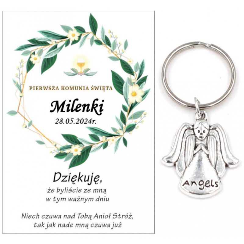 PAMIĄTKA PREZENT UPOMINEK DLA GOŚCI - BRELOCZEK ANIOEK Z OZDOBNĄ KARTECZKĄ NA KOMUNIĘ