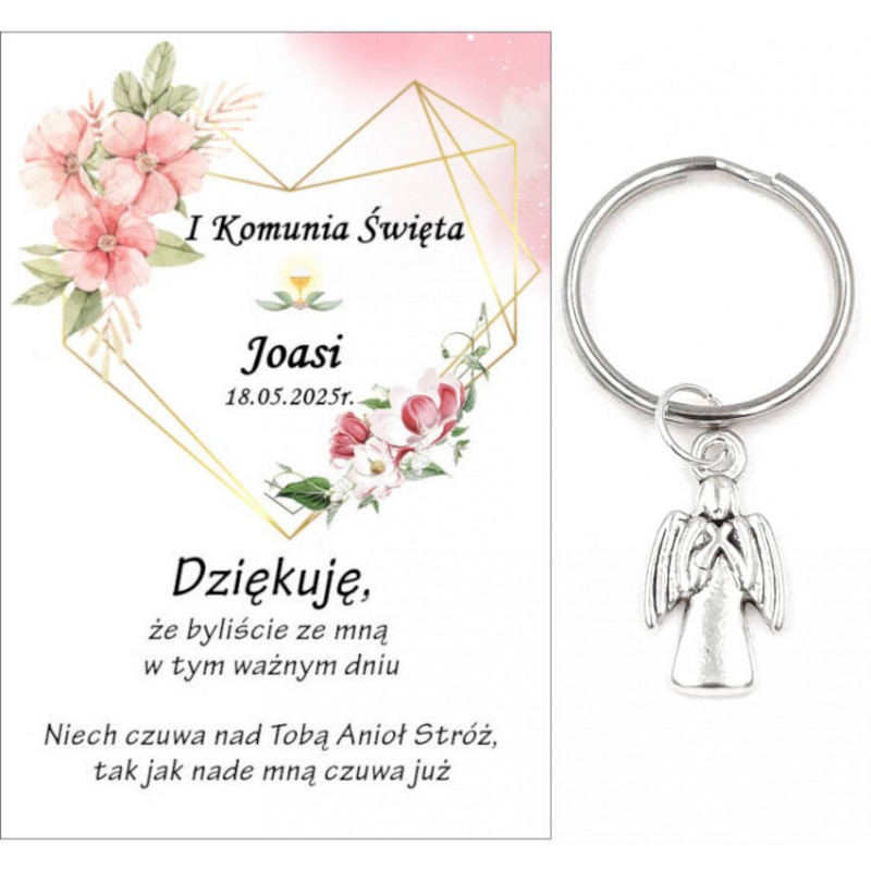 PAMIĄTKA PREZENT UPOMINEK DLA GOŚCI - BRELOCZEK ANIOEK Z OZDOBNĄ KARTECZKĄ NA KOMUNIĘ