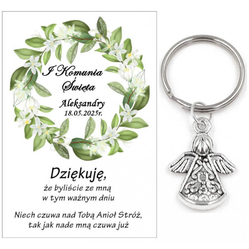 PAMIĄTKA PREZENT UPOMINEK DLA GOŚCI - BRELOCZEK ANIOEK Z OZDOBNĄ KARTECZKĄ NA KOMUNIĘ