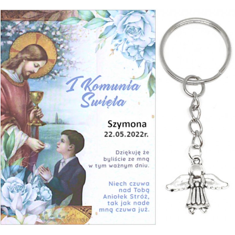 PAMIĄTKA PREZENT UPOMINEK DLA GOŚCI - BRELOCZEK ANIOEK NA ŁAŃCUSZKU Z OZDOBNĄ KARTECZKĄ NA KOMUNIĘ