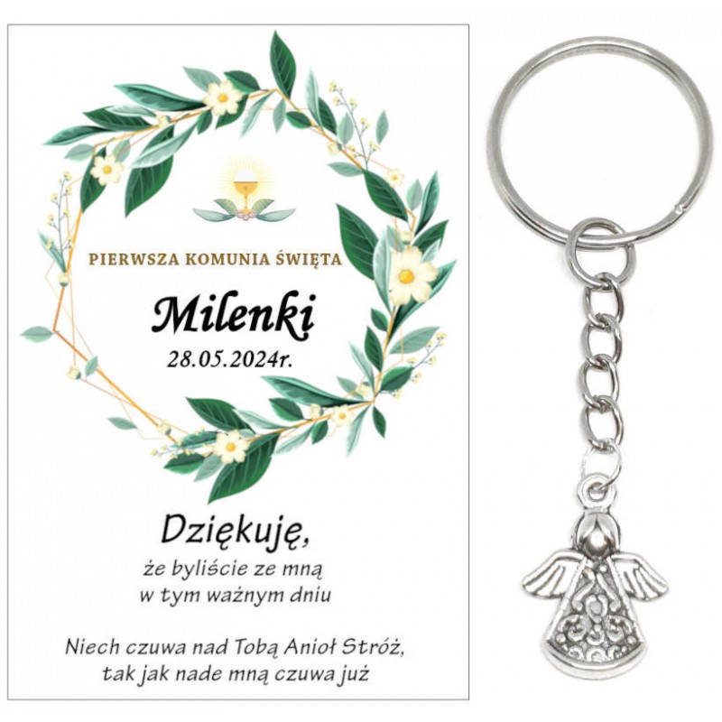 PAMIĄTKA PREZENT UPOMINEK DLA GOŚCI - BRELOCZEK ANIOEK NA ŁAŃCUSZKU Z OZDOBNĄ KARTECZKĄ NA KOMUNIĘ