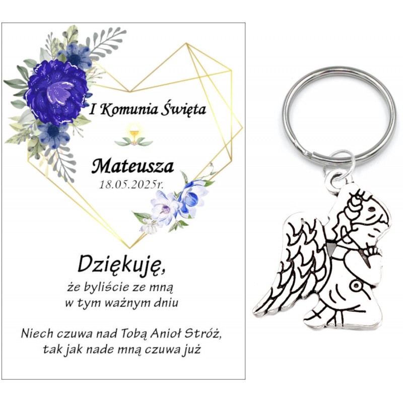 PAMIĄTKA PREZENT UPOMINEK DLA GOŚCI - BRELOCZEK ANIOEK Z OZDOBNĄ KARTECZKĄ NA KOMUNIĘ