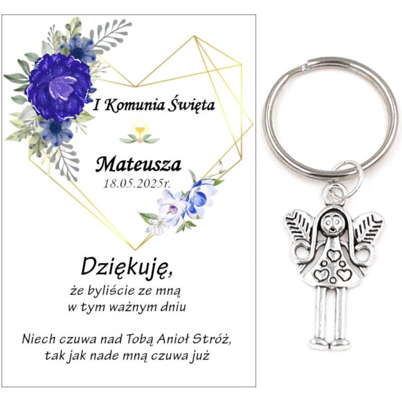 PAMIĄTKA PREZENT UPOMINEK DLA GOŚCI - BRELOCZEK ANIOEK Z OZDOBNĄ KARTECZKĄ NA KOMUNIĘ
