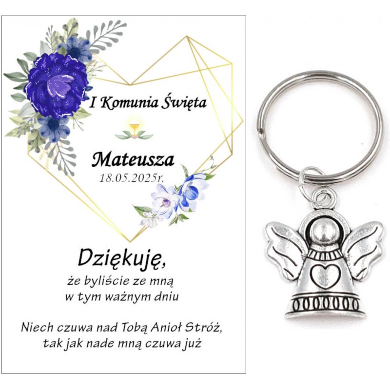 PAMIĄTKA PREZENT UPOMINEK DLA GOŚCI - BRELOCZEK ANIOEK Z OZDOBNĄ KARTECZKĄ NA KOMUNIĘ