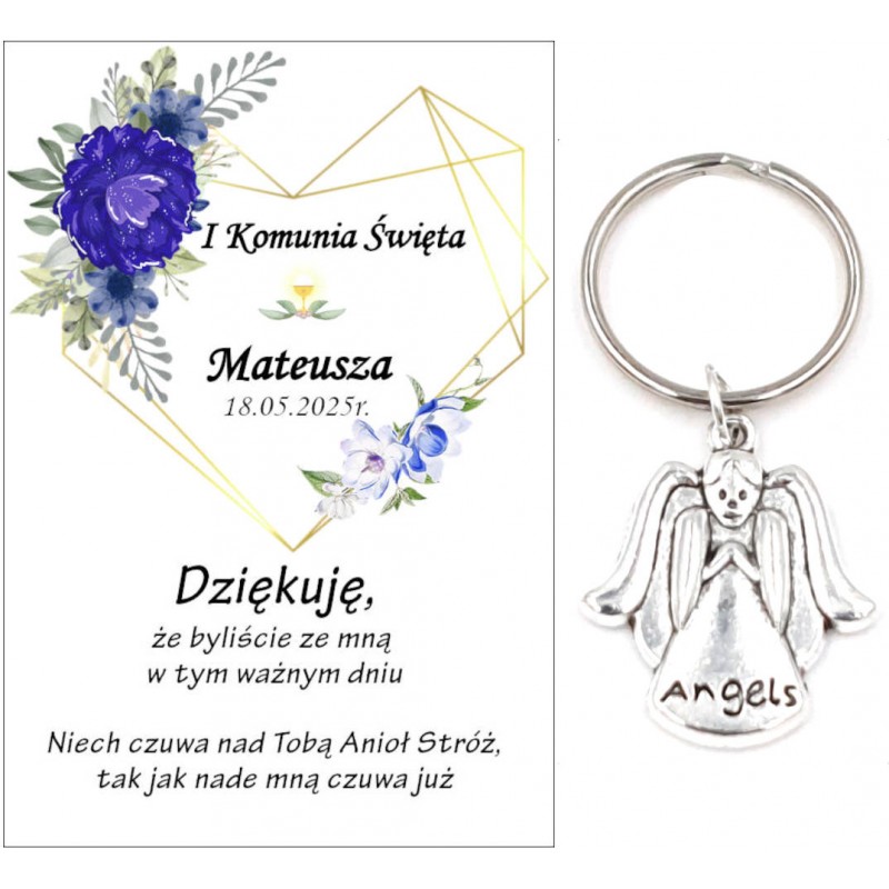 PAMIĄTKA PREZENT UPOMINEK DLA GOŚCI - BRELOCZEK ANIOEK Z OZDOBNĄ KARTECZKĄ NA KOMUNIĘ