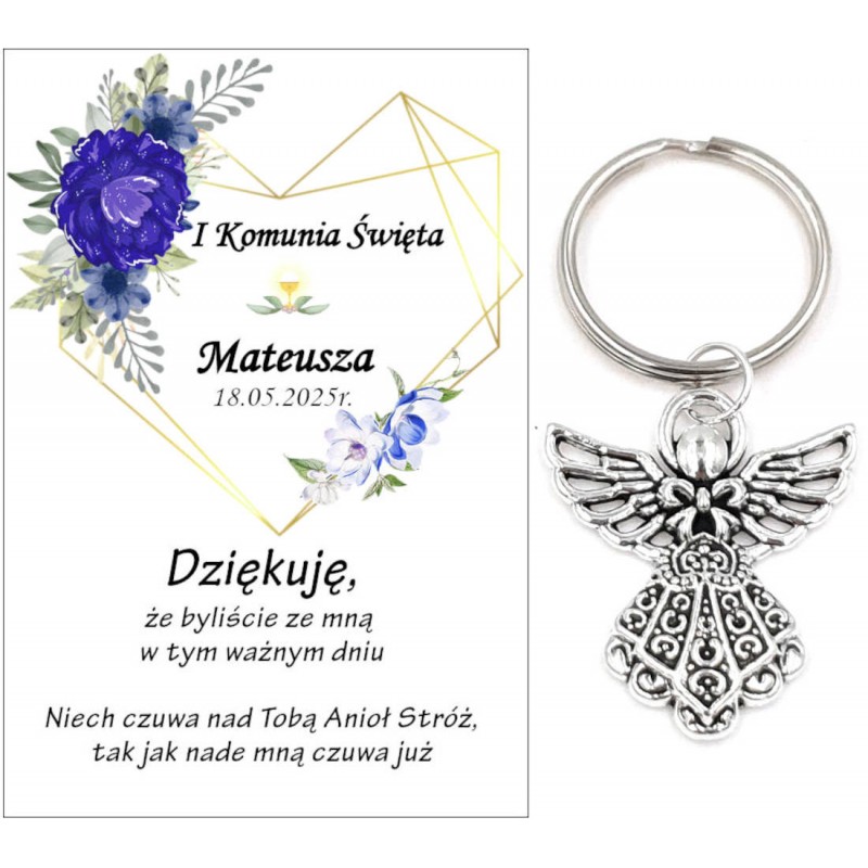 PAMIĄTKA PREZENT UPOMINEK DLA GOŚCI - BRELOCZEK ANIOEK Z OZDOBNĄ KARTECZKĄ NA KOMUNIĘ