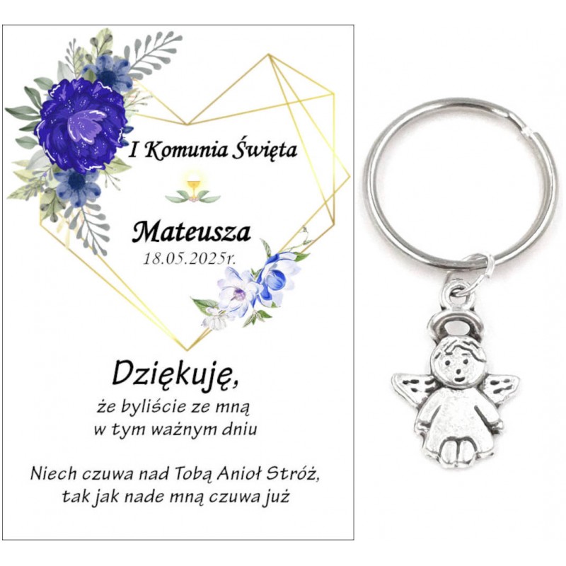 PAMIĄTKA PREZENT UPOMINEK DLA GOŚCI - BRELOCZEK ANIOEK Z OZDOBNĄ KARTECZKĄ NA KOMUNIĘ