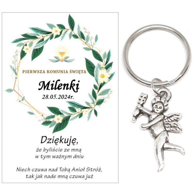 PAMIĄTKA PREZENT UPOMINEK DLA GOŚCI - BRELOCZEK ANIOŁEK Z OZDOBNĄ KARTECZKĄ NA KOMUNIĘ
