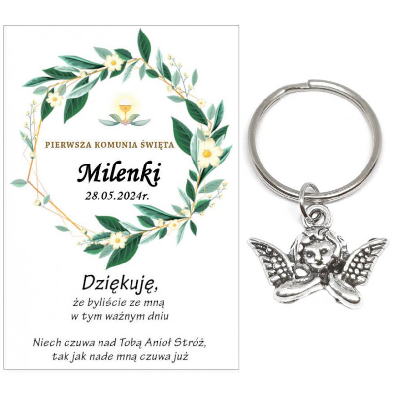 PAMIĄTKA PREZENT UPOMINEK DLA GOŚCI - BRELOCZEK ANIOŁEK Z OZDOBNĄ KARTECZKĄ NA KOMUNIĘ