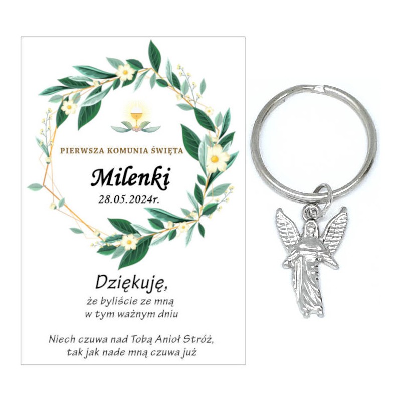 PAMIĄTKA PREZENT UPOMINEK DLA GOŚCI - BRELOCZEK ANIOŁEK Z OZDOBNĄ KARTECZKĄ NA KOMUNIĘ